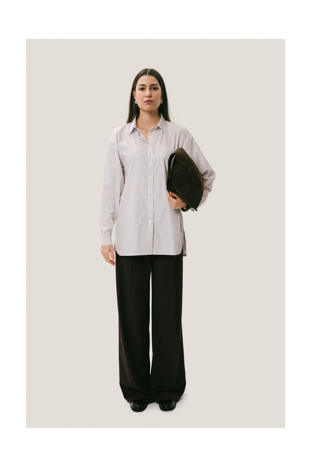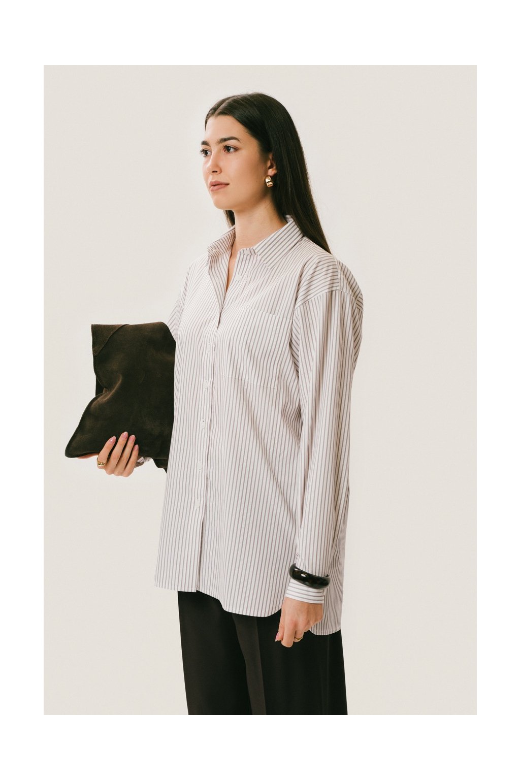 Nadčasový kousek, ke kterému se budeš vracet znovu a znovu. Emily jsme ušily z čistého bavlněného popelínu, který je lehký, prodyšný, drží tvar a působí dokonale upraveně po celý den. Jemný hnědý proužek dodává košili minimalistický, ale výrazný detail, který pozvedne každý outfit. Košile má oversize střih se spadlým rukávem, který jí dodává ležérní eleganci a dělá z ní jeden z nejuniverzálnějších kousků šatníku. Pod svetr, kolem pasu nebo jen tak zakasaná či vykasaná – pokaždé působí jinak, přirozeně a chic.