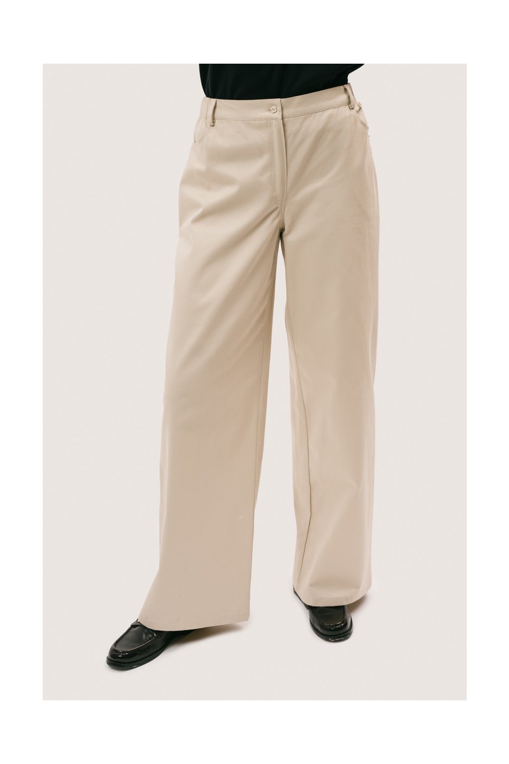 Kalhoty Megan spojují uvolněnou estetiku džínů s lehkostí tkaných kalhot. Jsou ušité z pevné bavlněné tkaniny typu twill, která krásně drží tvar a dodává siluetě moderní a lehce casual charakter. Střih inspirovaný džíny doplňují typické kapsy a zapínání na zip s knoflíkem. V pase je široká guma s poutky na pásek, díky které kalhoty působí uvolněně a zároveň zůstávají pohodlné při nošení.