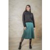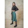Když jsme hledali vhodný materiál na jednoduchou slavnostní sukni, která by ale šla nosit i na běžné příležitosti, volba padla na satén. Vhodný na mimořádné chvíle například s úzkým topem a podpatky nebo v kombinaci s ležérní mikinou a vysokými botami na každodenní nošení. Sukně se krásně nese, je splývavá, jemně kopíruje postavu tím, že je šikmo střižená a délka do půlky lýtek lichotí všem postavám. Do pasu po stranách jsme všili gumu, aby se přizpůsobila každé postavě a v pase neškrtila. A zaujme i krásná tmavě zelená barva saténu.