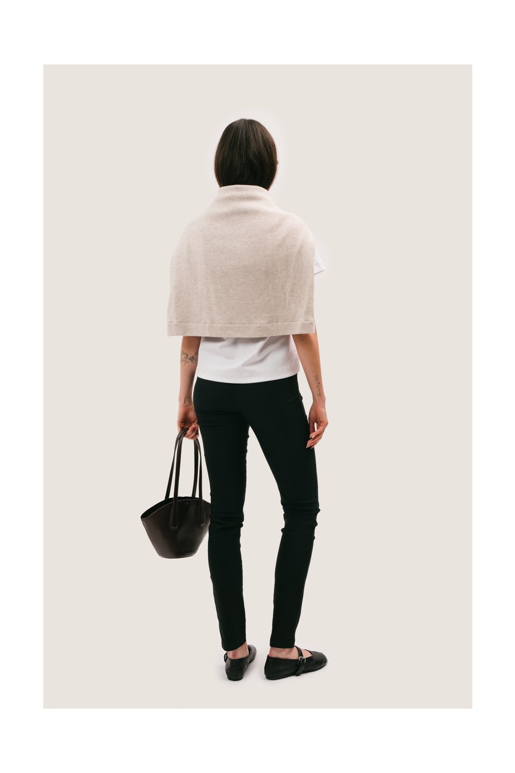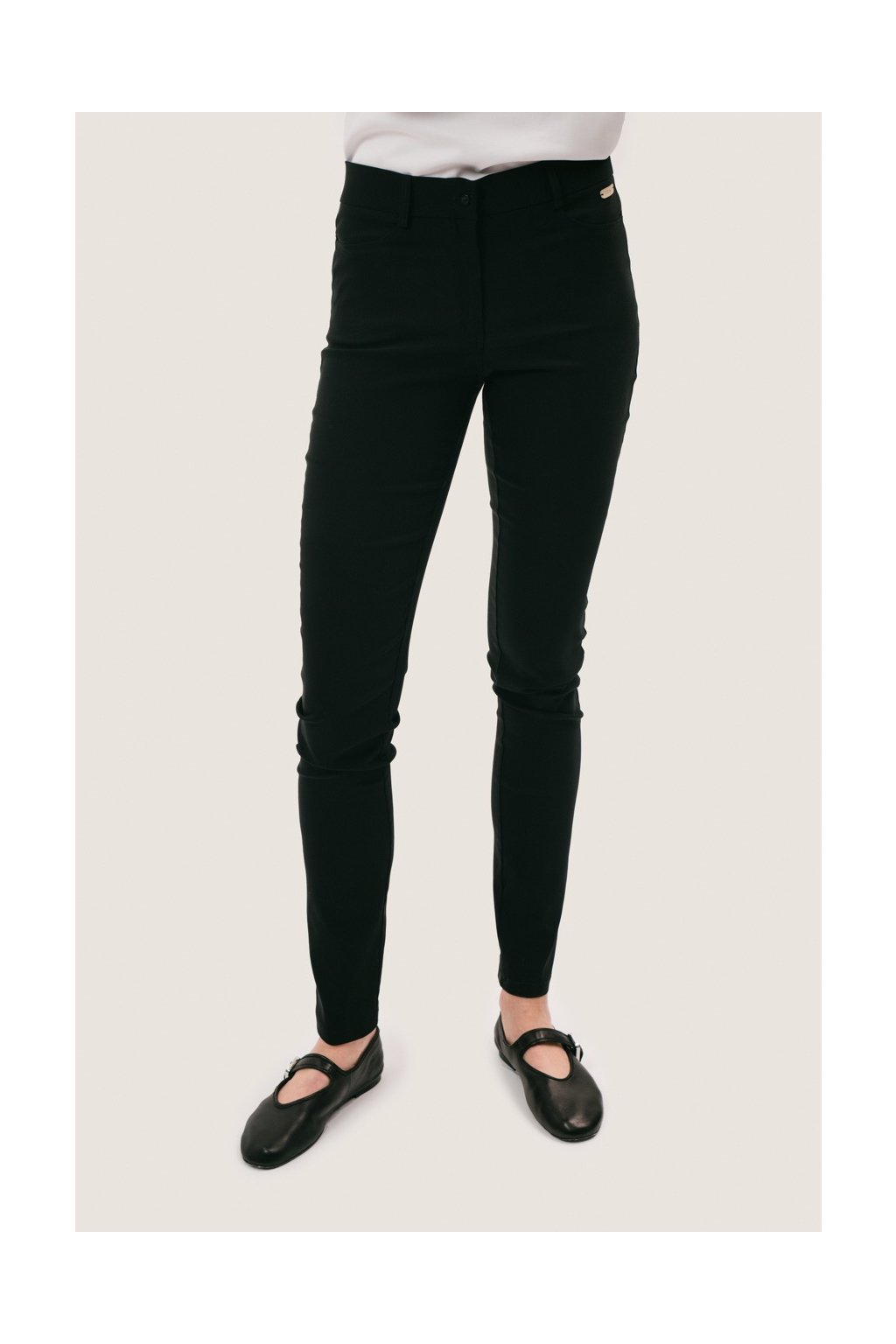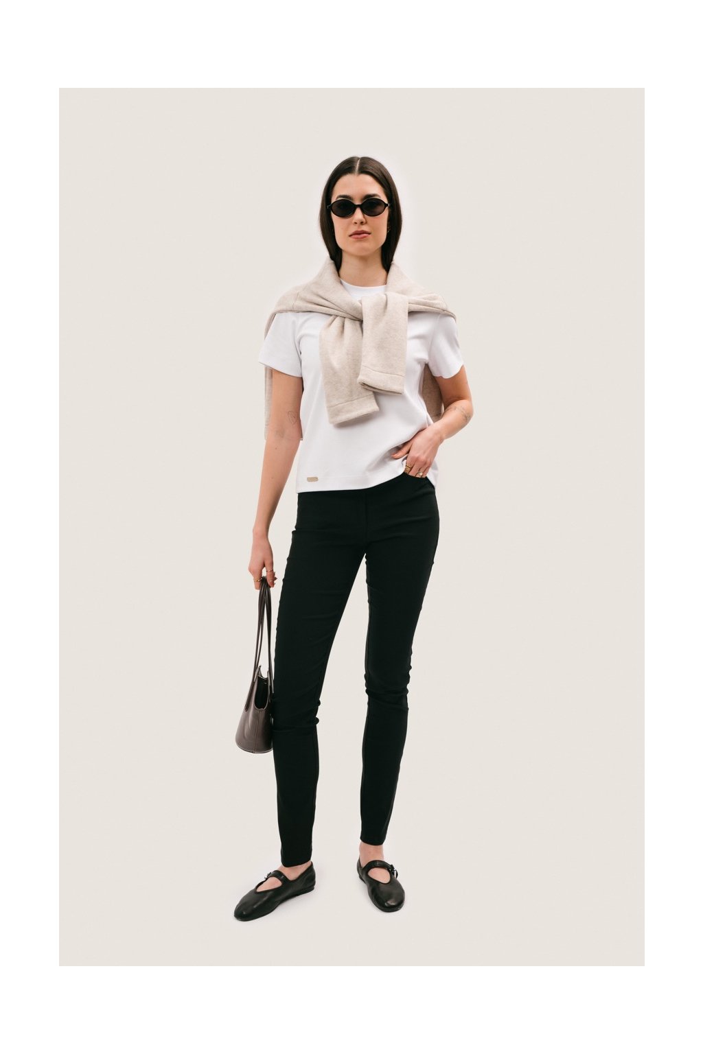 Kalhoty Janet mají čistou, přiléhavou siluetu, která zvýrazňuje linii postavy a přirozeně sedí v pase. Měkký, pružný materiál zajišťuje pohodlí při nošení a zároveň drží tvar. Detail sedla na zadním díle jemně formuje siluetu, zatímco přední kapsy inspirované denimem dodávají modelu ležérní charakter.
